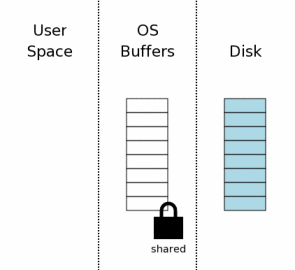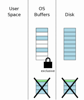 When a new file is created, most desktop operating systems (Windows, Linux, Mac OS X) will not actually write anything to disk. The new file is created in the operating systems disk cache only. The file is not created on mass storage until sometime later, when the operating system has a spare moment. This creates the impression to users that I/O is happening much faster than is possible when doing real disk I/O. We illustrate this idea in the diagram to the right by showing that the new rollback journal appears in the operating system disk cache only and not on the disk itself.