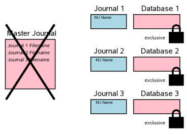 For brevity, the diagrams in this section are simplified from those that came before. Blue color still signifies original content and pink still signifies new content. But the individual pages in the rollback journal and the database file are not shown and we are not making the distinction between information in the operating system cache and information that is on disk. All of these factors still apply in a multi-file commit scenario. They just take up a lot of space in the diagrams and they do not add any new information, so they are omitted here.